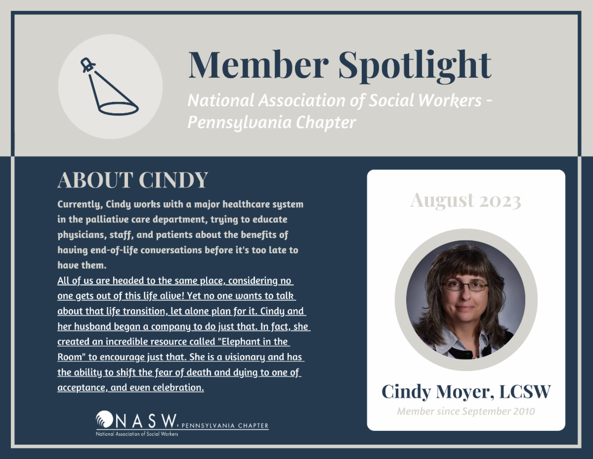 Currently, Cindy works with a major healthcare system in the palliative care department, trying to educate physicians, staff, and patients about the benefits of having end-of-life conversations before it's too late to have them. All of us are headed to the same place, considering no one gets out of this life alive! Yet no one wants to talk about that life transition, let alone plan for it. Cindy and her husband began a company to do just that. In fact, she created an incredible resource called "Elephant in the Room" to encourage just that. She is a visionary and has the ability to shift the fear of death and dying to one of acceptance, and even celebration. Member since September 2010 |